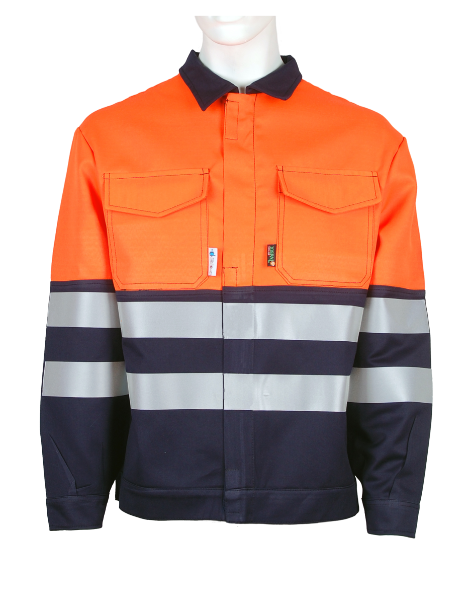 Cazadora para trabajos de baja visibilidad, multinorma y certificado con 50 lavados a 60º, ofrece unas prestaciones únicas en el mercado, con cierre central cremallera oculta, puño cierre marca VELCRO ®, bandas grises ignífugas y cosidas con hilo de aramida ignífugo.