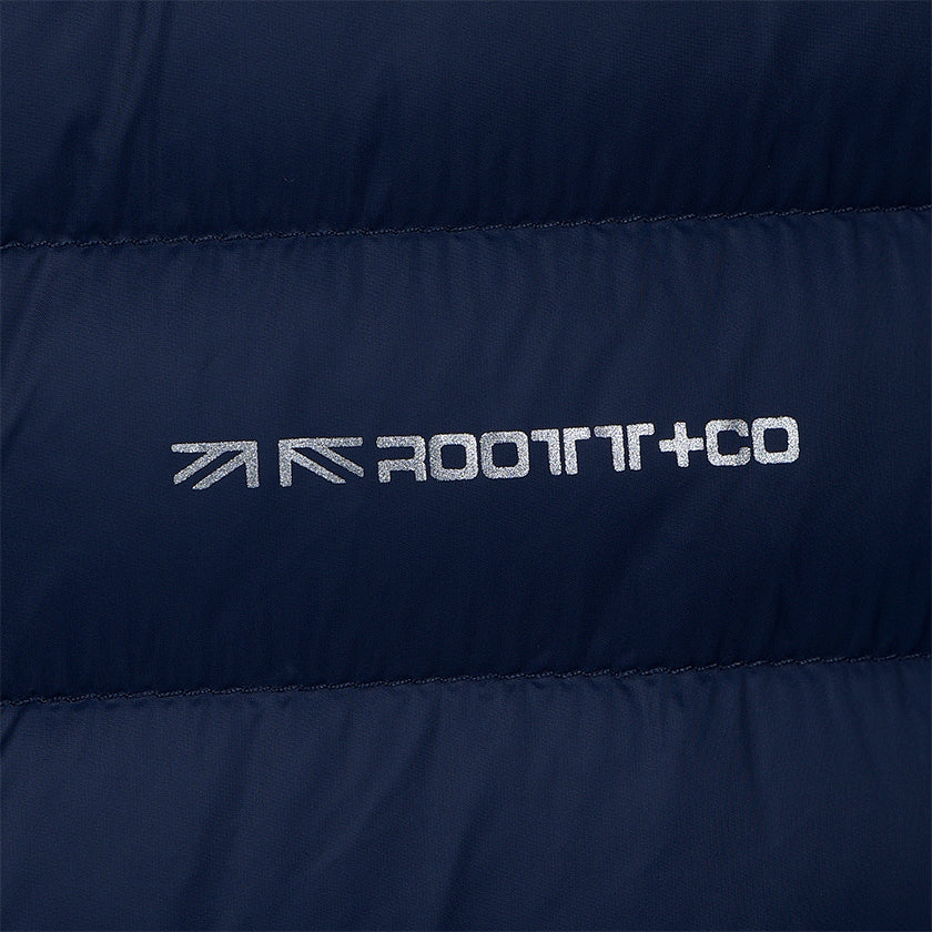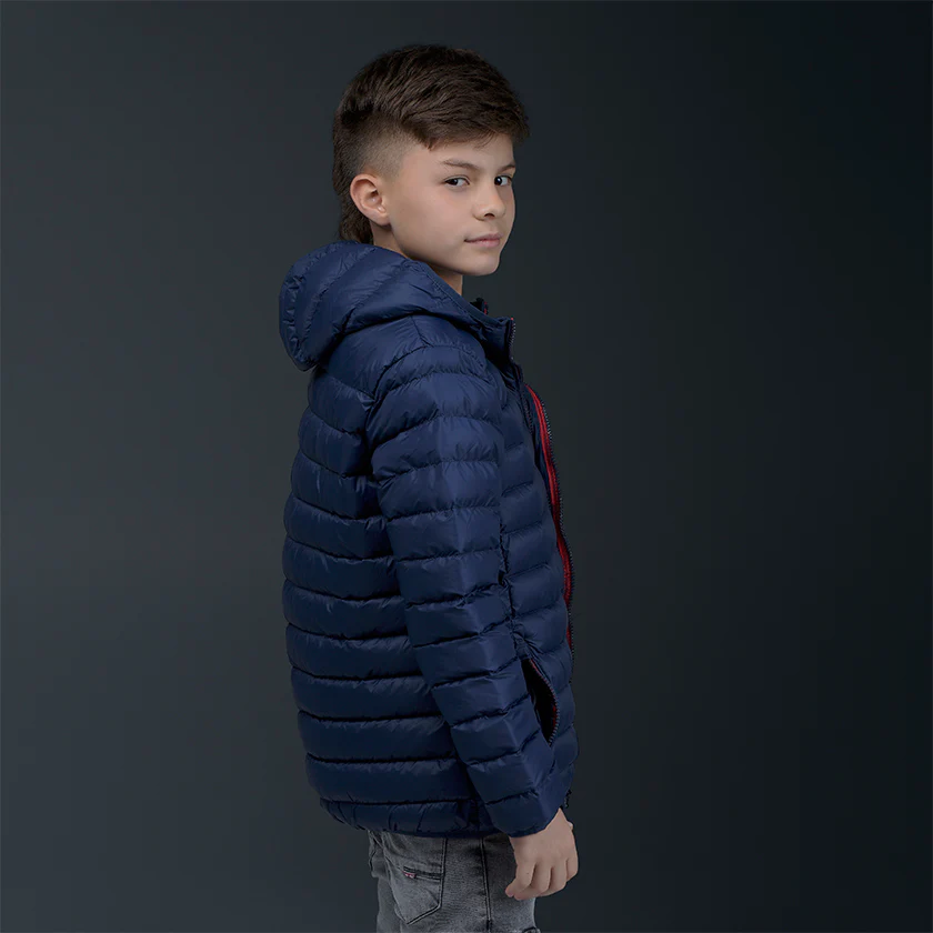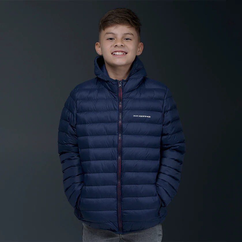 Chaqueta abullonada para niño. Presenta logo ROOTT+CO en el pecho y cierre de cremallera, luce diseño acolchado con pespuntes en horizontal y bolsillos con ribete ancho delanteros.