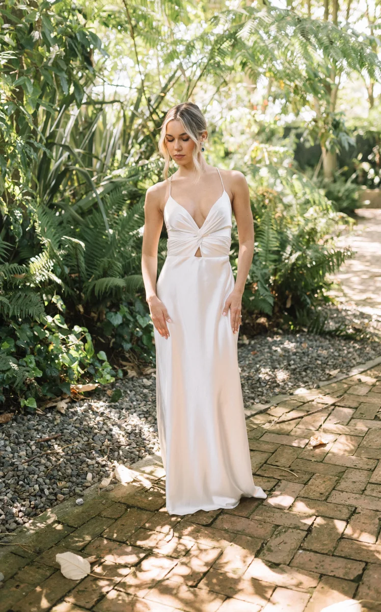 Vestido largo elegante para fiesta o matrimonio en playa con tiras ajustable en la espalda en tela seda/polyester.