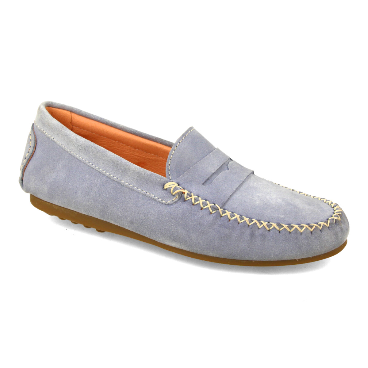 Este mocasín de mujer en azul claro es la elección perfecta para quienes buscan estilo, frescura y comodidad. Fabricado en ante suave de alta calidad, su diseño tipo penny loafer sin borlas ofrece un look limpio y atemporal. Las costuras a contraste hechas a mano aportan un toque artesanal que refuerza su carácter elegante. Su tonalidad pastel lo convierte en una opción versátil y original para la primavera y el verano. La plantilla interior acolchada y la suela flexible antideslizante proporcionan comodidad y seguridad durante toda la jornada. Un zapato funcional, estilizado y duradero para cualquier ocasión.