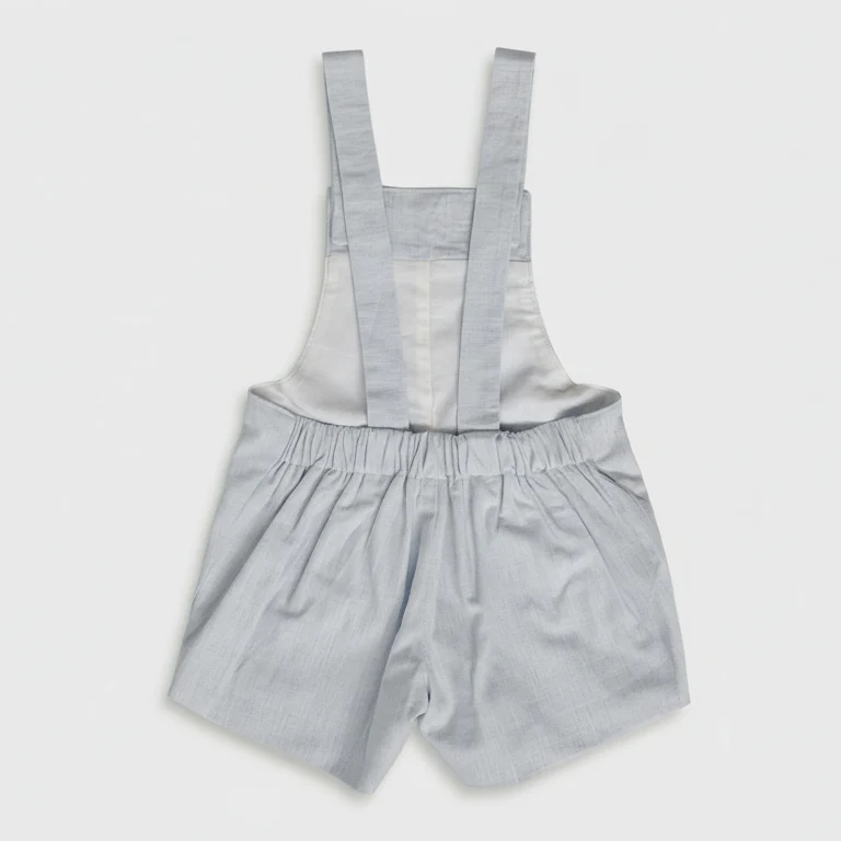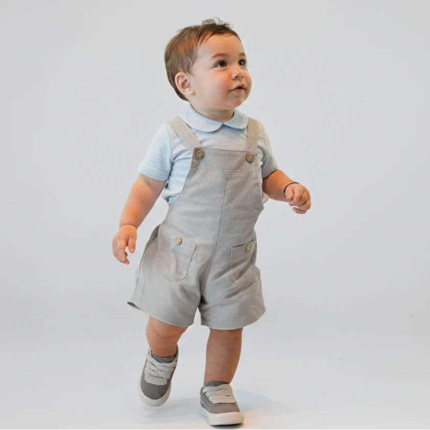 Overall con bolsillos elaborado en 100% algodón gris claro. Elegante y cómodo, perfecto para las ocasiones especiales de tu bebé. Combínalo con nuestras camisas niño en color azul o blanco.
