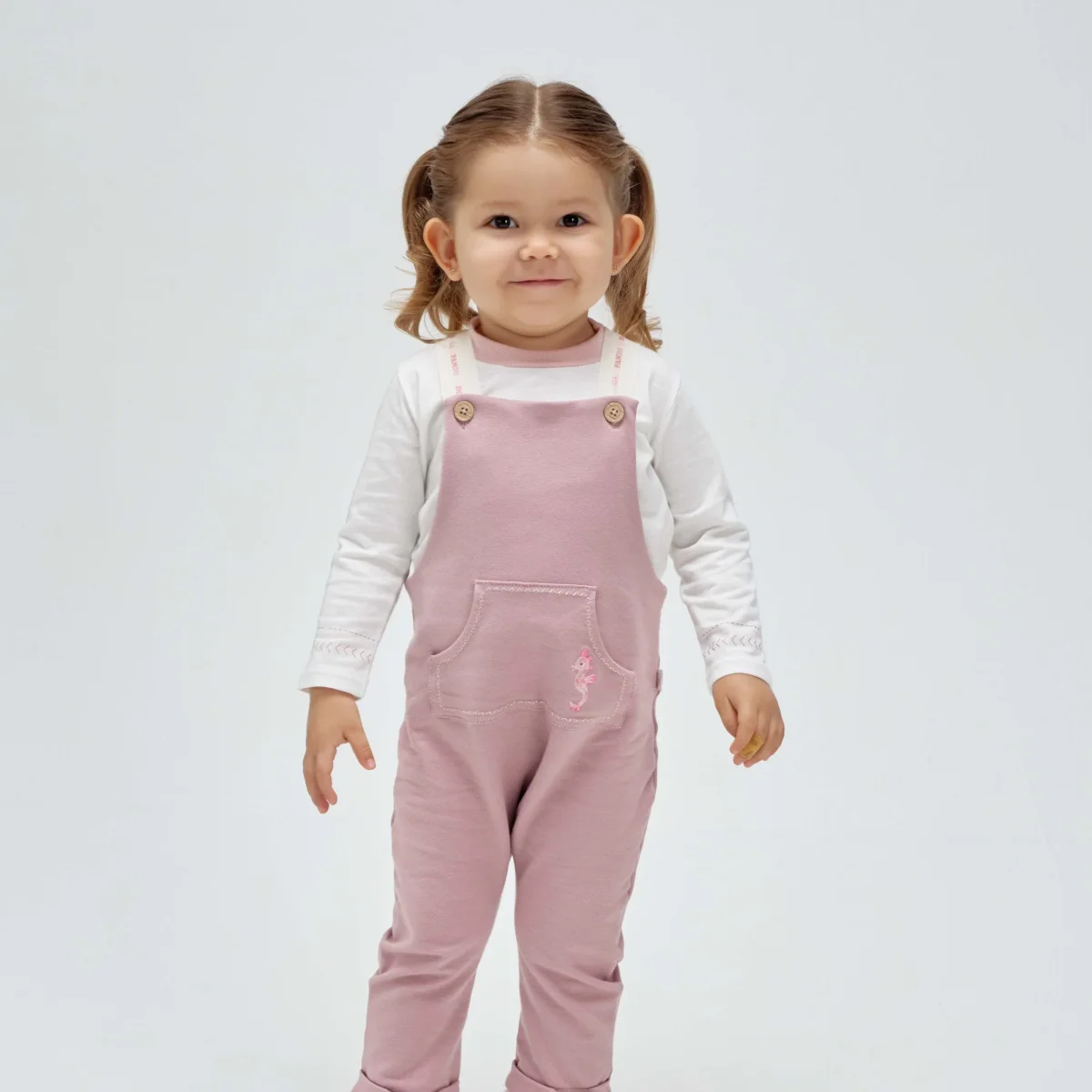 Overall en burda con un delicado bordado en el bolsillo y cargaderas en contraste, haz el match perfecto con nuestra camiseta ML caballo de mar.