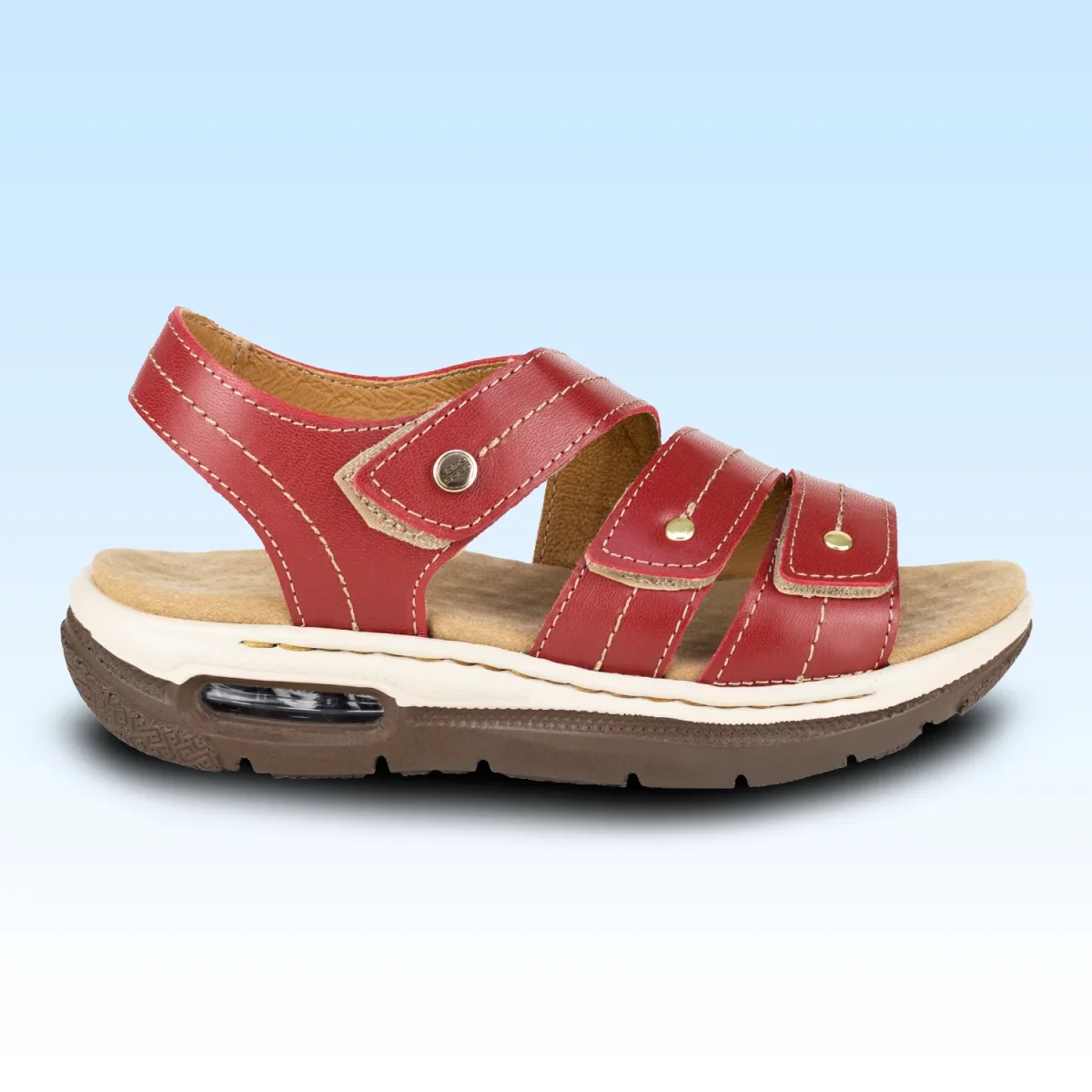 La sandalia para mujer Lobo Solo modelo 2102 es la elección perfecta para quienes buscan estilo, comodidad y versatilidad en un solo diseño, disponible en dos colores elegantes rojo y marfil que se adaptan tanto a un look casual como a un día de playa o actividades al aire libre. Elaborada con corte en piel vacuno y forro de cerdo que aportan suavidad y resistencia, esta sandalia destaca por su plataforma con cápsula de aire integrada en la suela sintética, una innovación que reduce el cansancio al caminar y brinda una sensación de ligereza y amortiguación en cada paso.