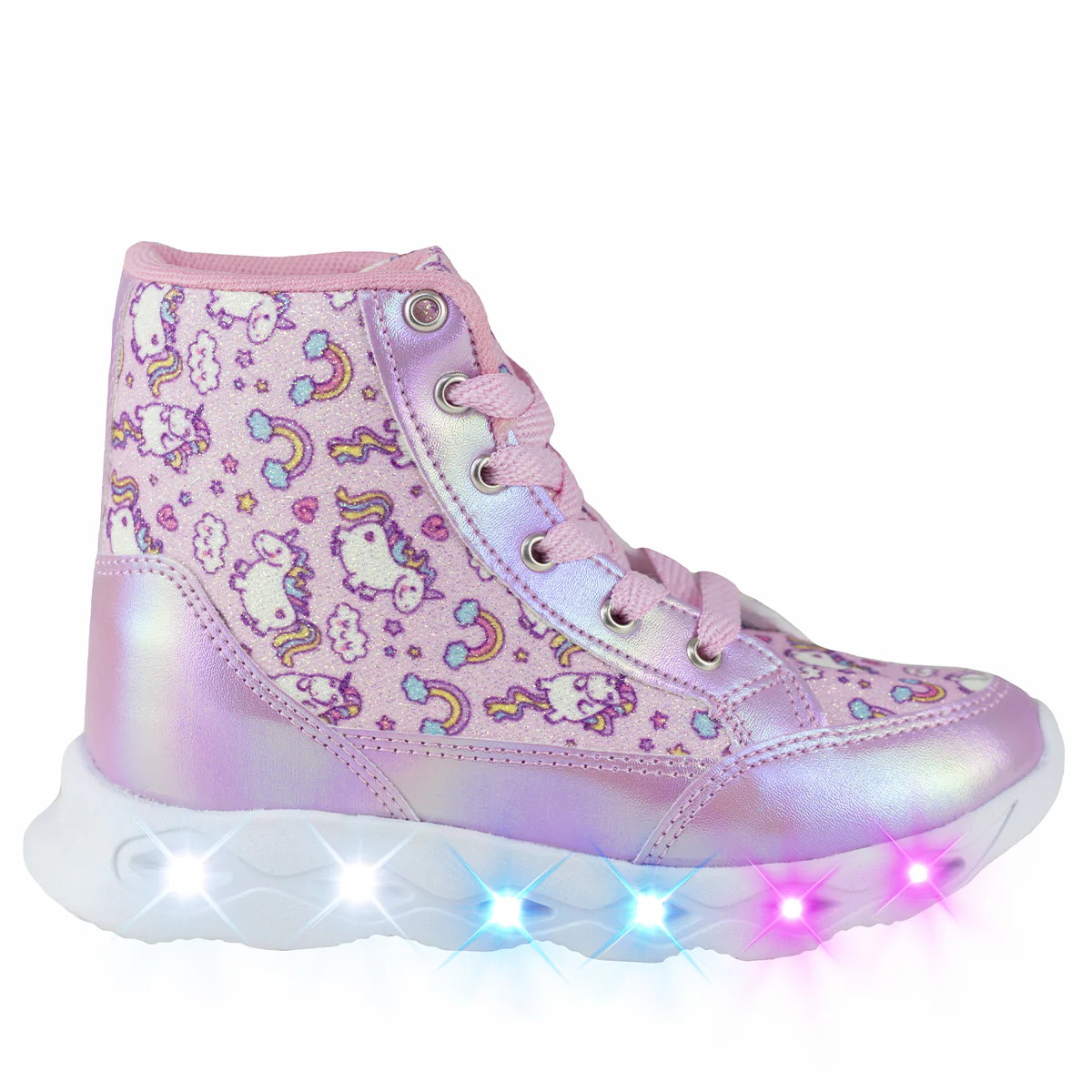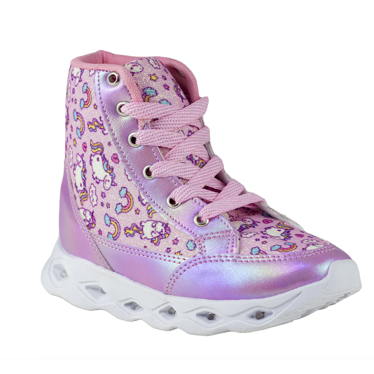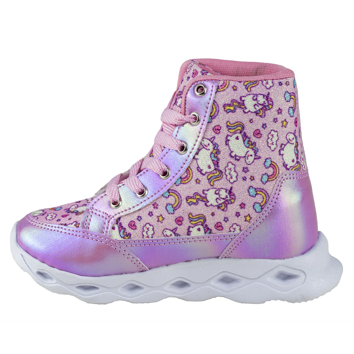 TENIS TIPO BOTA URBANOS CON SUELA DE LUCES LED PARA NIÑAS FORRO EXTERIOR DE UNICORNIOS EXTRA LIVIANAS