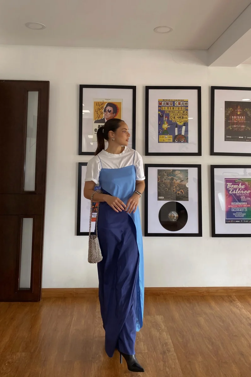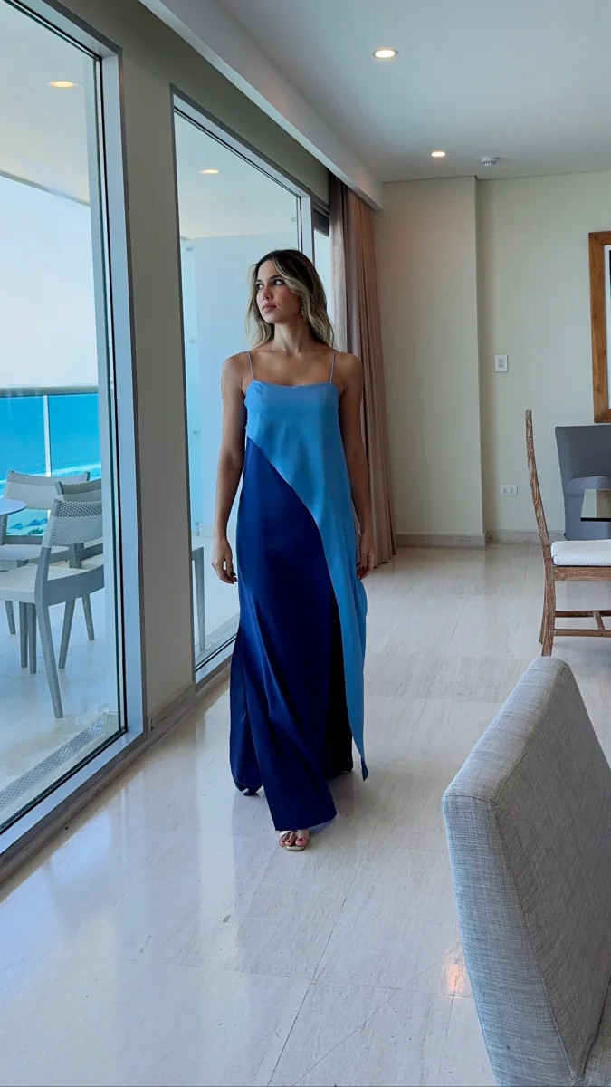 Vestido largo elegante bitono para fiesta o matrimonio en playa elaborado en tela seda/polyester.