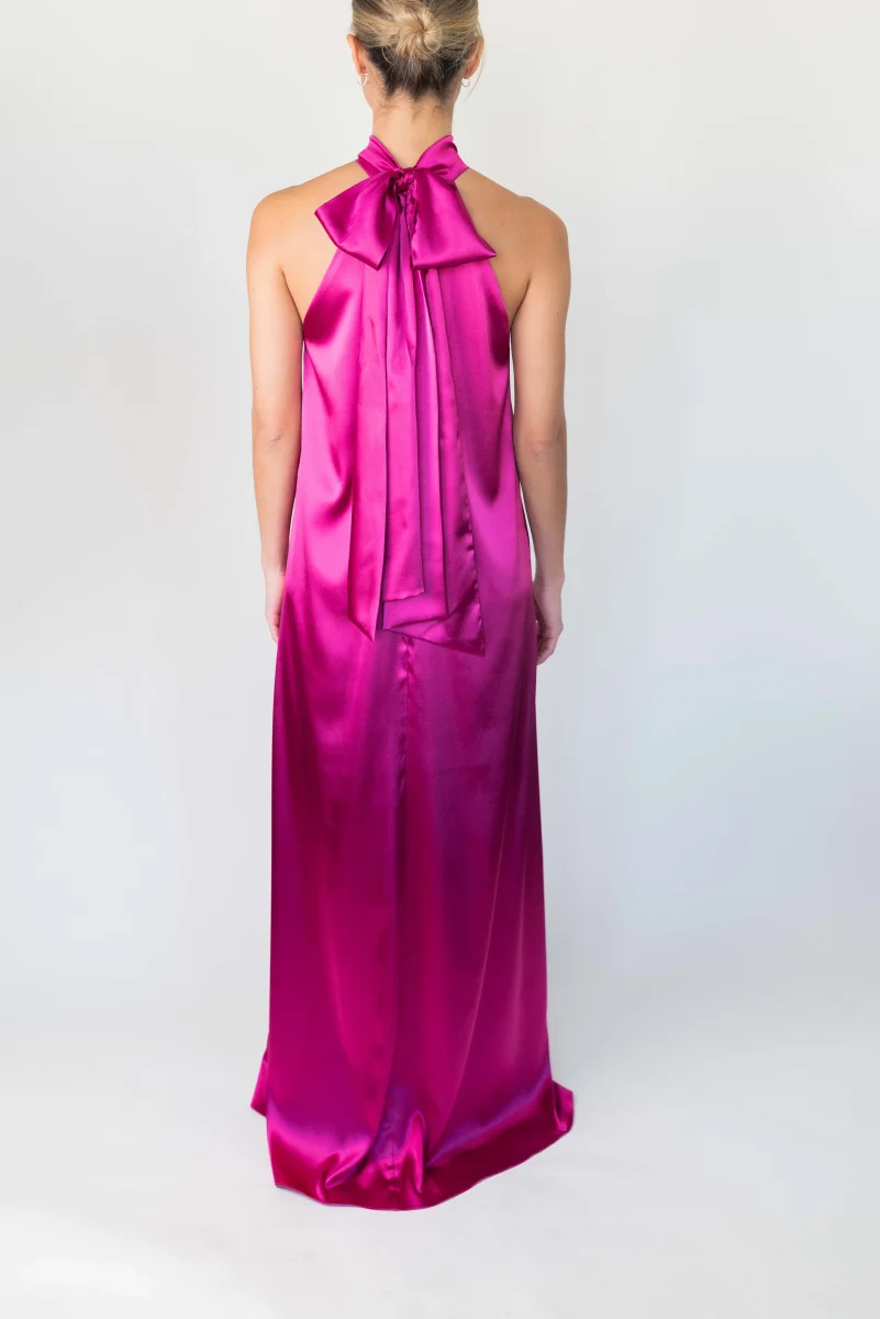 Vestido largo elegante para matrimonios con detalle en la parte de atrás del cuello elaborado en tela seda/polyester.