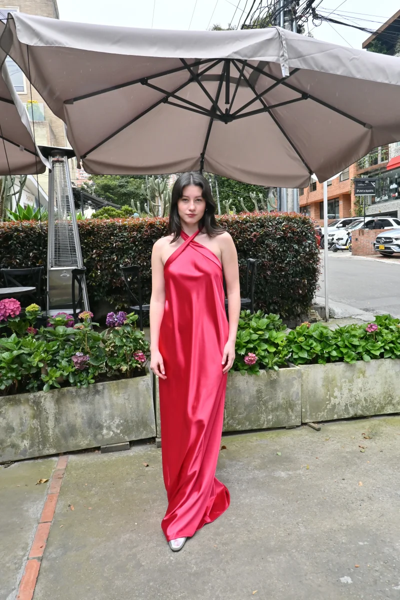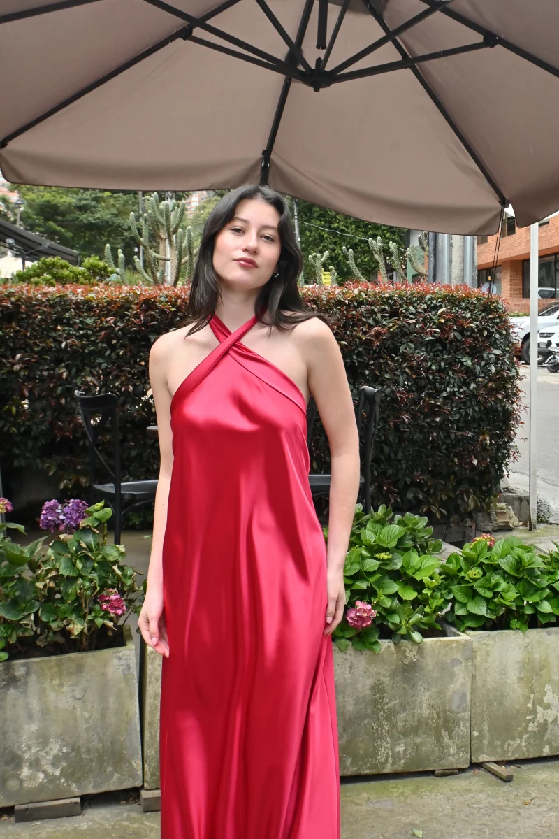 Vestido largo color rubí para matrimonio elegante en seda con espalda descubierta y tiras gruesas.