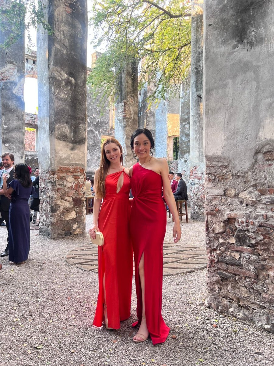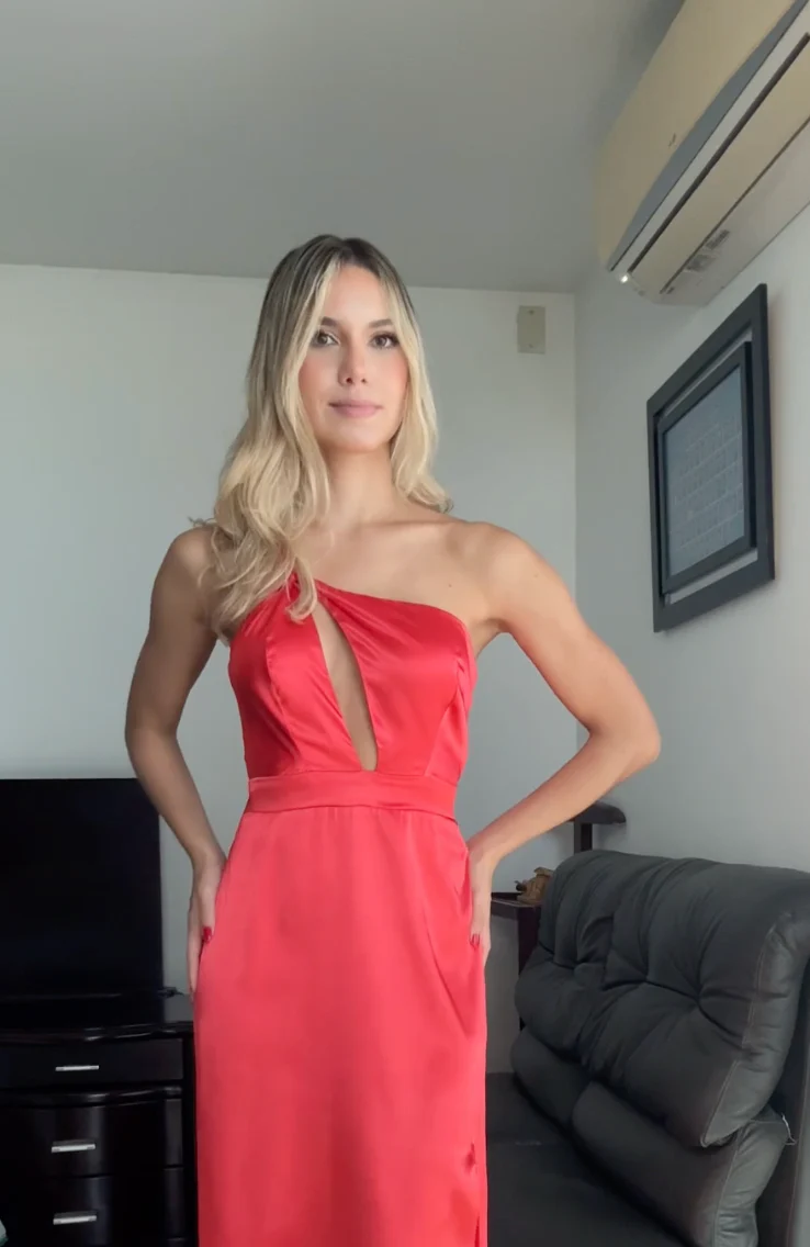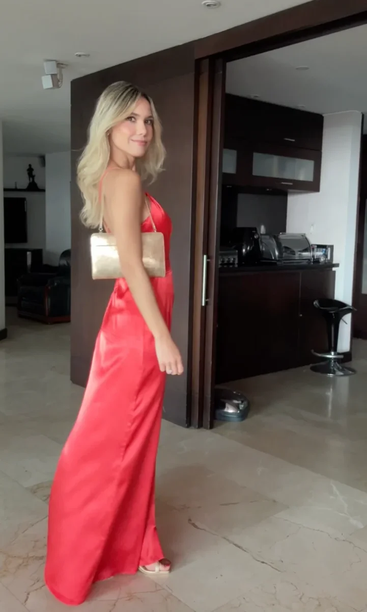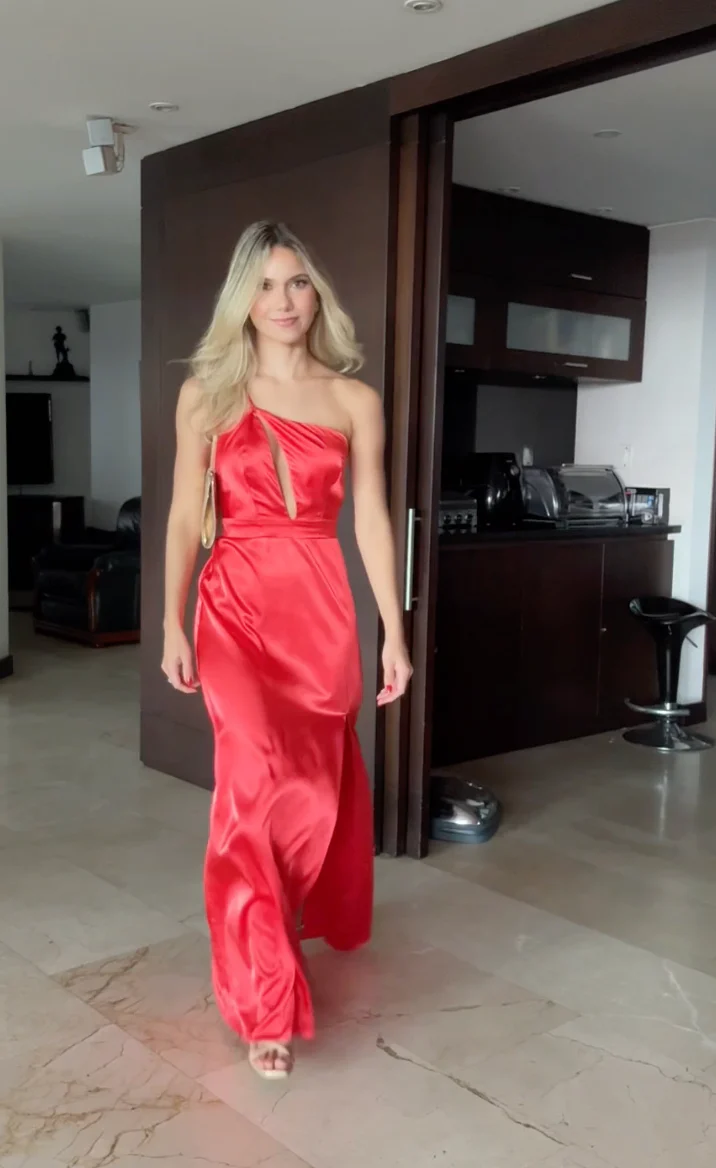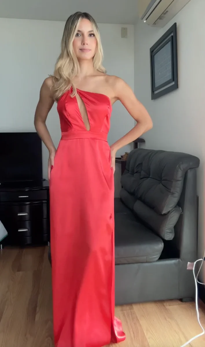Vestido largo rojo de una sola tira elaborado en seda satinada.