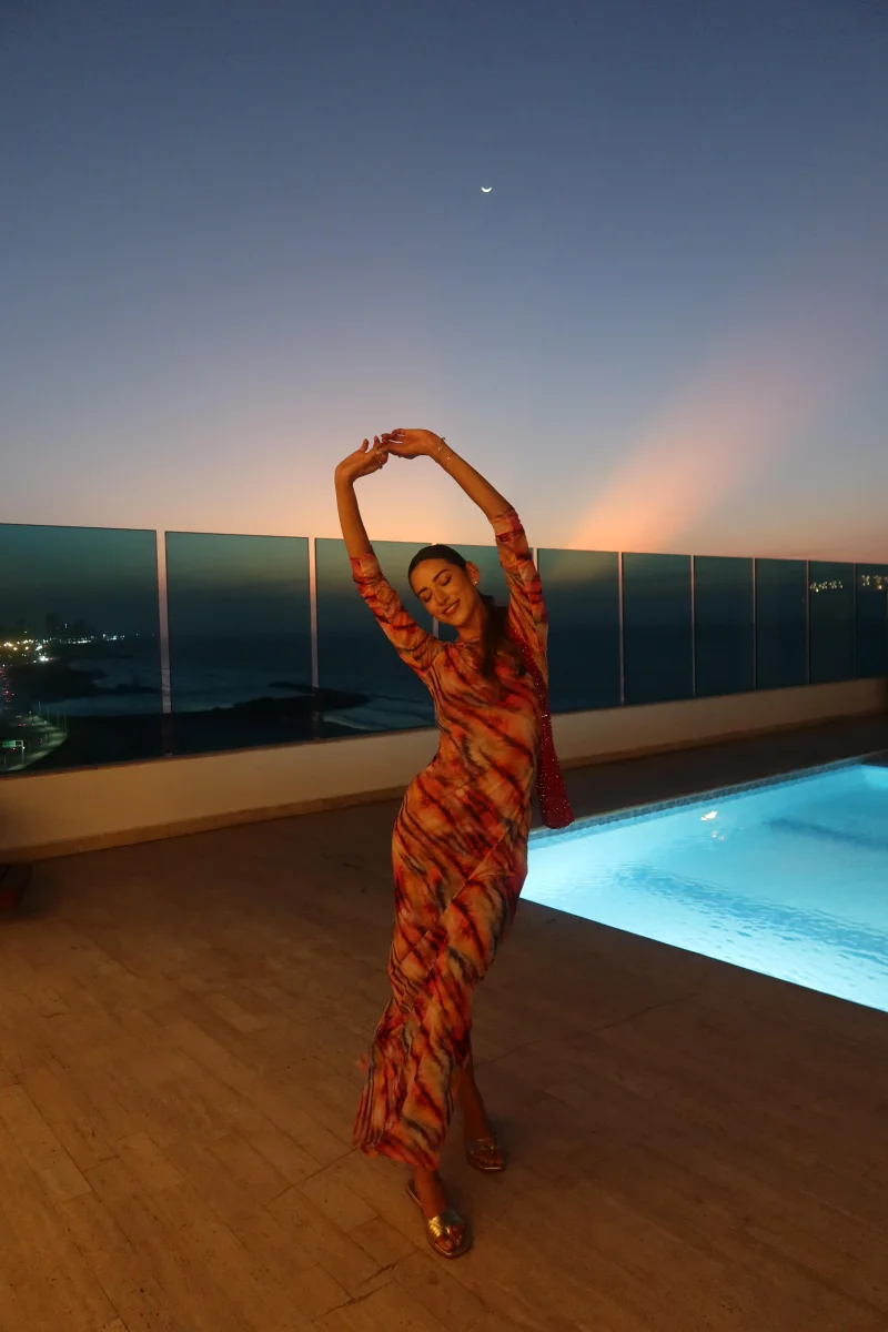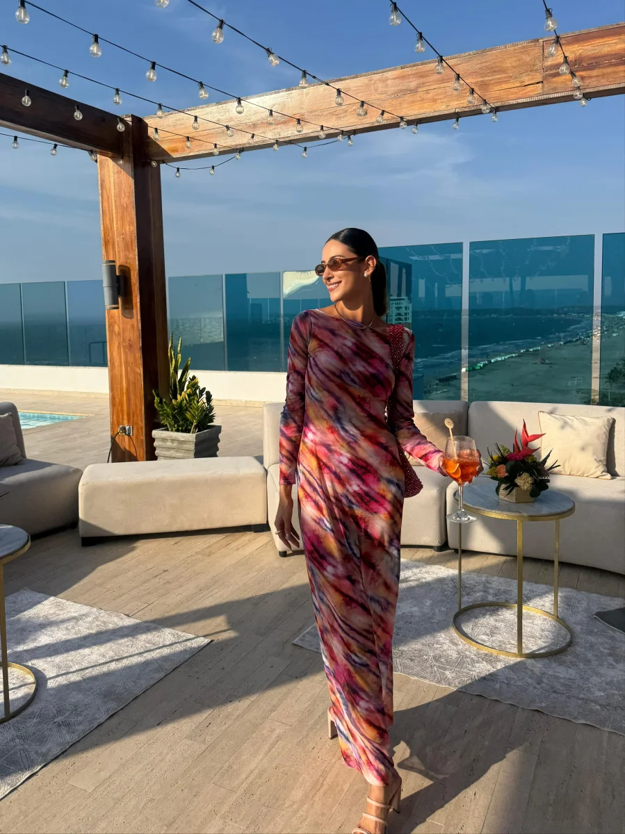 Vestido manga larga. Elaborado en tela maya multicolor.