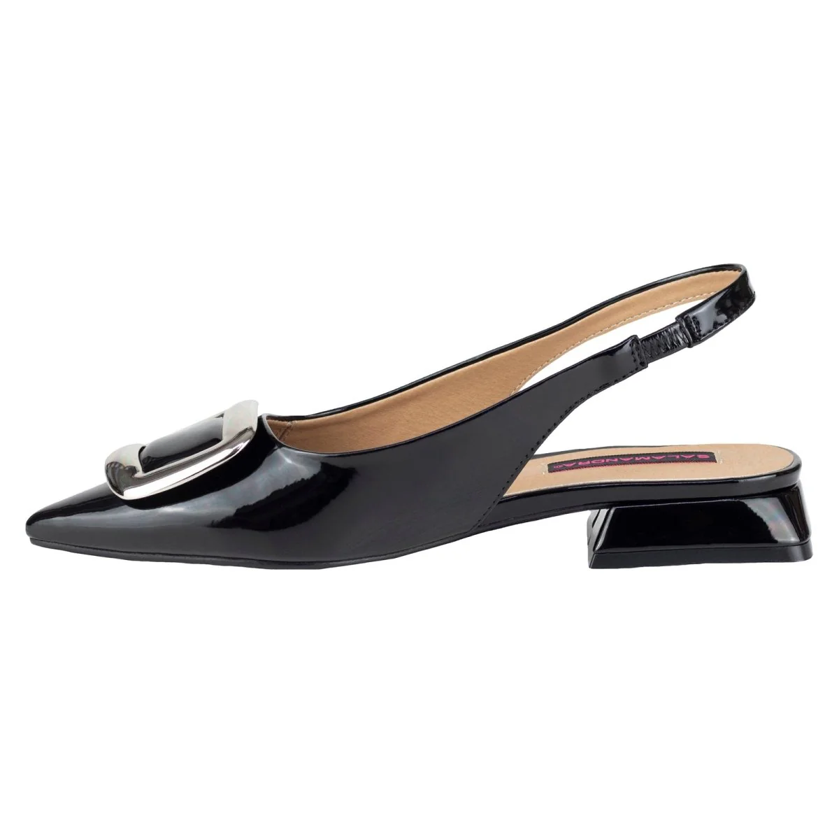ZAPATO FLAT DESTALONADO PUNTA PUNTIAGUDA AJUSTE DE CORRE TRASERA SALAMANDRA CHAROL PARA MUJER